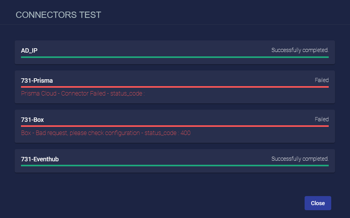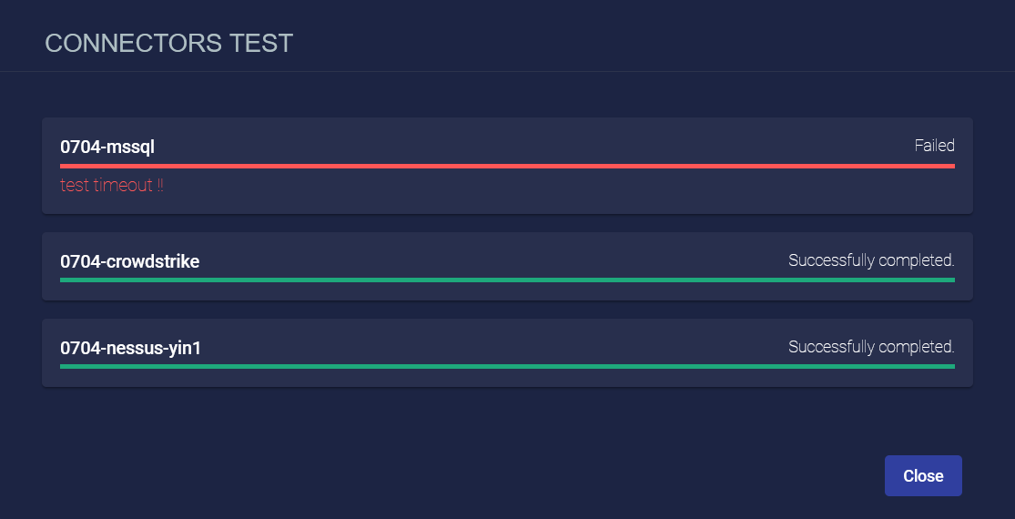 View the results of the tests in the Connectors Test dialog. Successfully completed tests are displayed in green, while Failed tests are displayed in red.