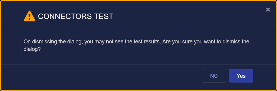 While tests are running, do not navigate away from the Connectors Test dialog as it may halt the testing process. The following message is displayed.