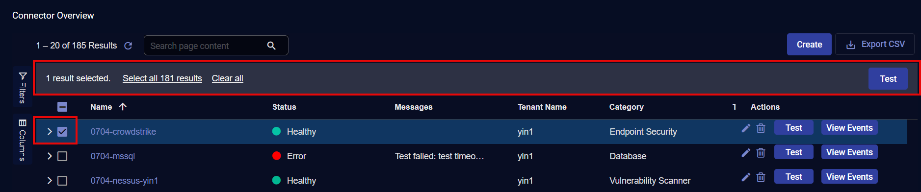 You can select several connectors to test them in bulk. You can select up to 10 connectors. Do not navigate away from the test page or the process may halt.