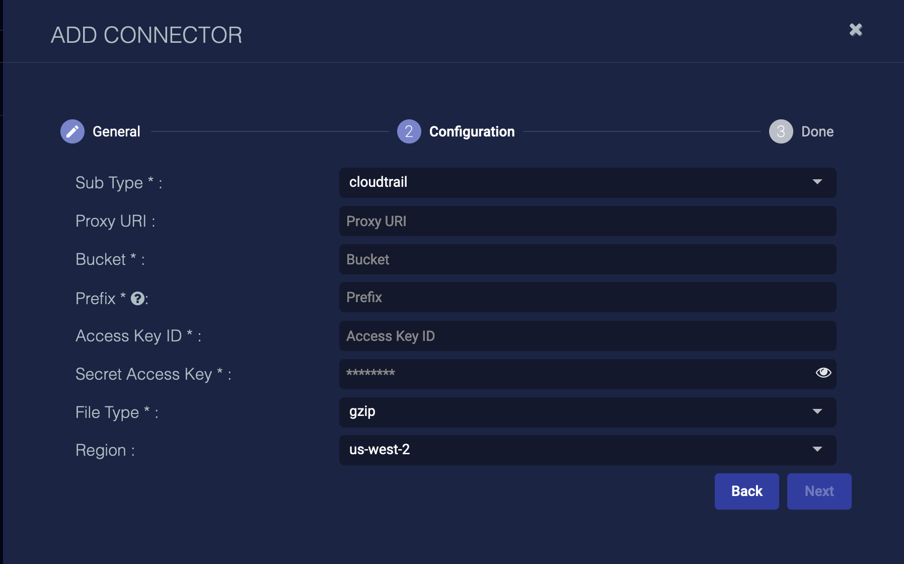 With the trail set up and the bucket name and path handy, you can add the AWS CloudTrail connector in Stellar Cyber: