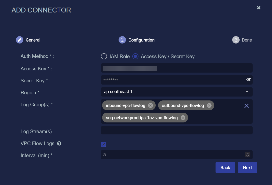 For Access Key / Secret Key authentication: Access Key and Secret Key, plus Region, and Log Group(s)