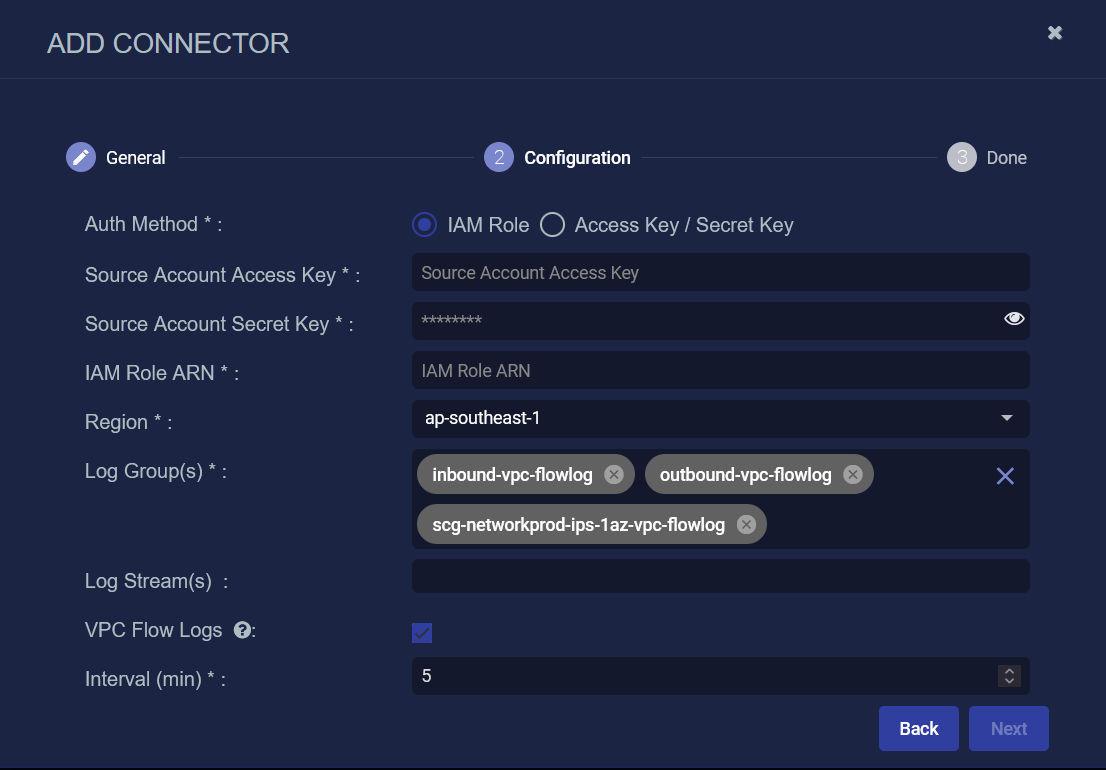 When configuring the connector in Stellar Cyber, you will need the destination AWS account (MSSP's tenant account), the IAM role ARN, as well as the CloudWatch log group name.