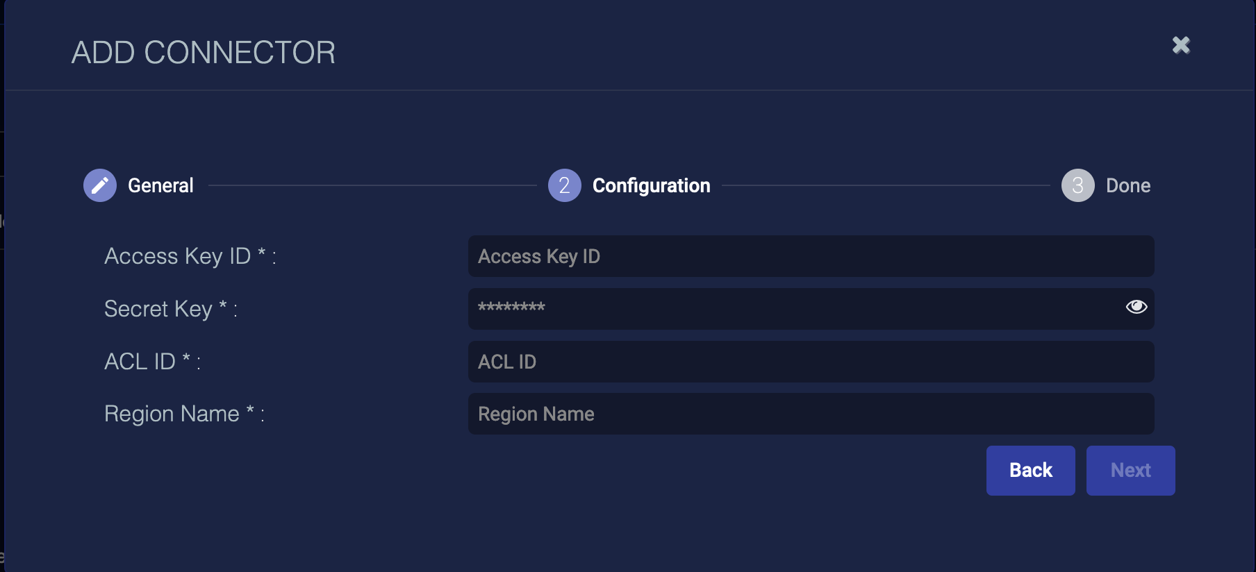 Access Key ID, Secret Key, ACL ID, and Region Name