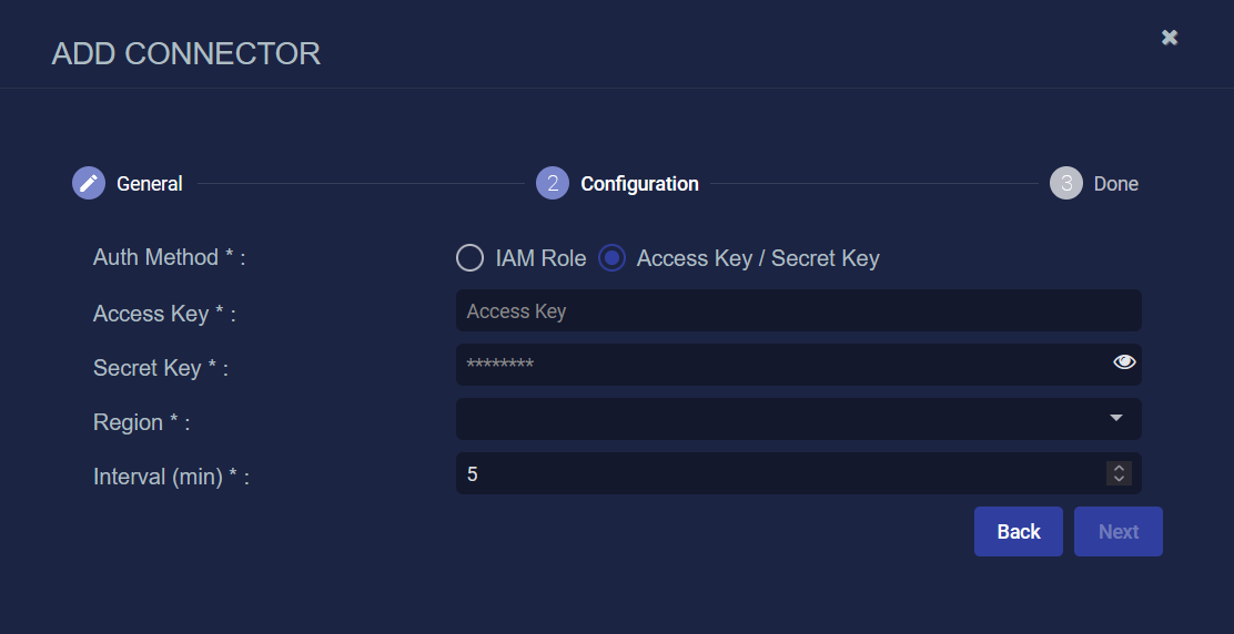 When configuring the connector in Stellar Cyber, you will need the source AWS account (MSSP account) and the access key and secret key.