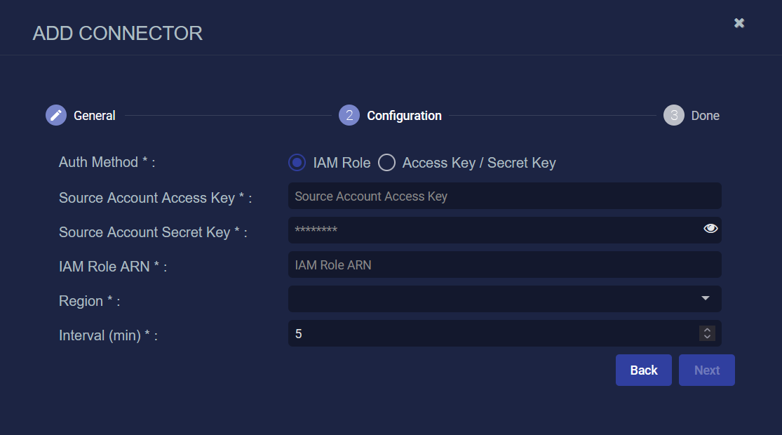 For IAM Role authentication: Source Account Access Key, Source Account Secret Key, and IAM Role ARN, plus Region