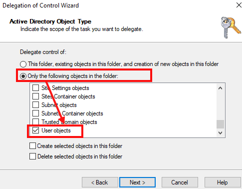 In the Delegation of Control Wizard, select the radio button for Only the following objects in the folder.