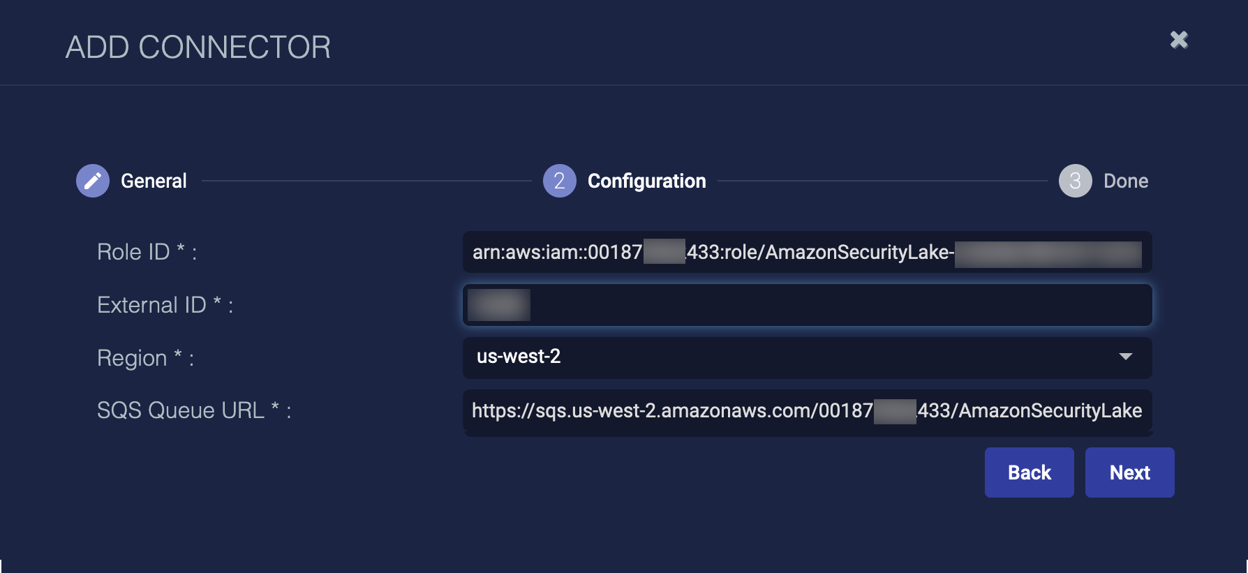 AWS Role ID, External ID, and SQS Queue URL, as well as Region