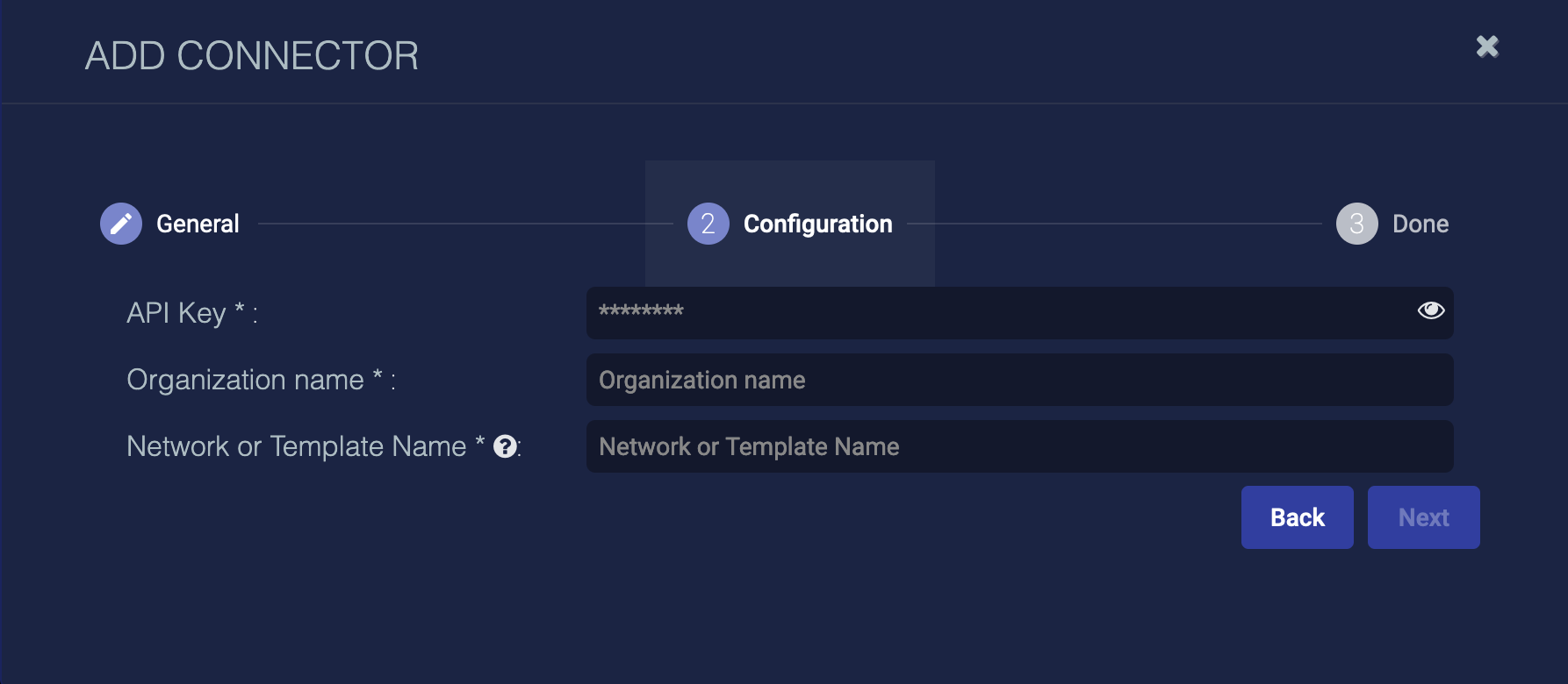 API Key, Organization Name, Network or Template Name
