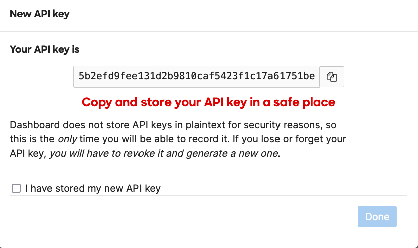 Make note of that key as you will not be able to view it later, then check the note box and click Done.