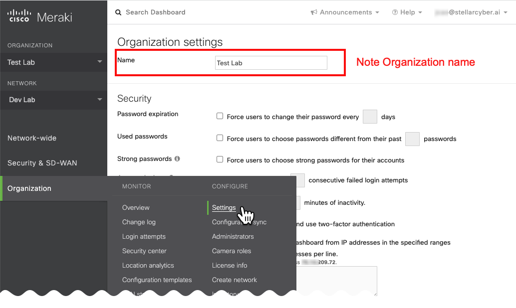 Other than having your firewall rules enabled, you will need to obtain the following three things from your Cisco Meraki account: