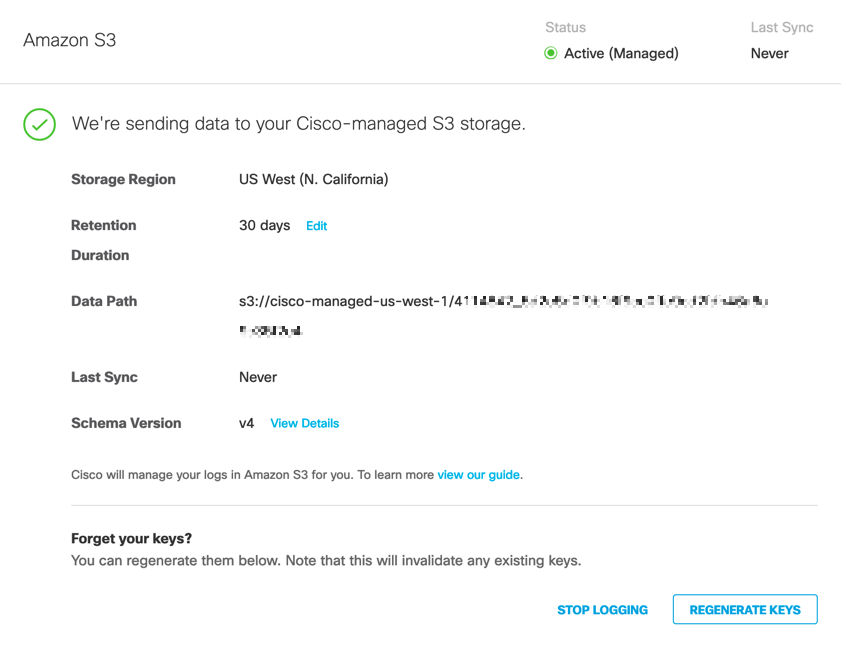 Click Continue. The Amazon S3 section now displays your S3 storage.