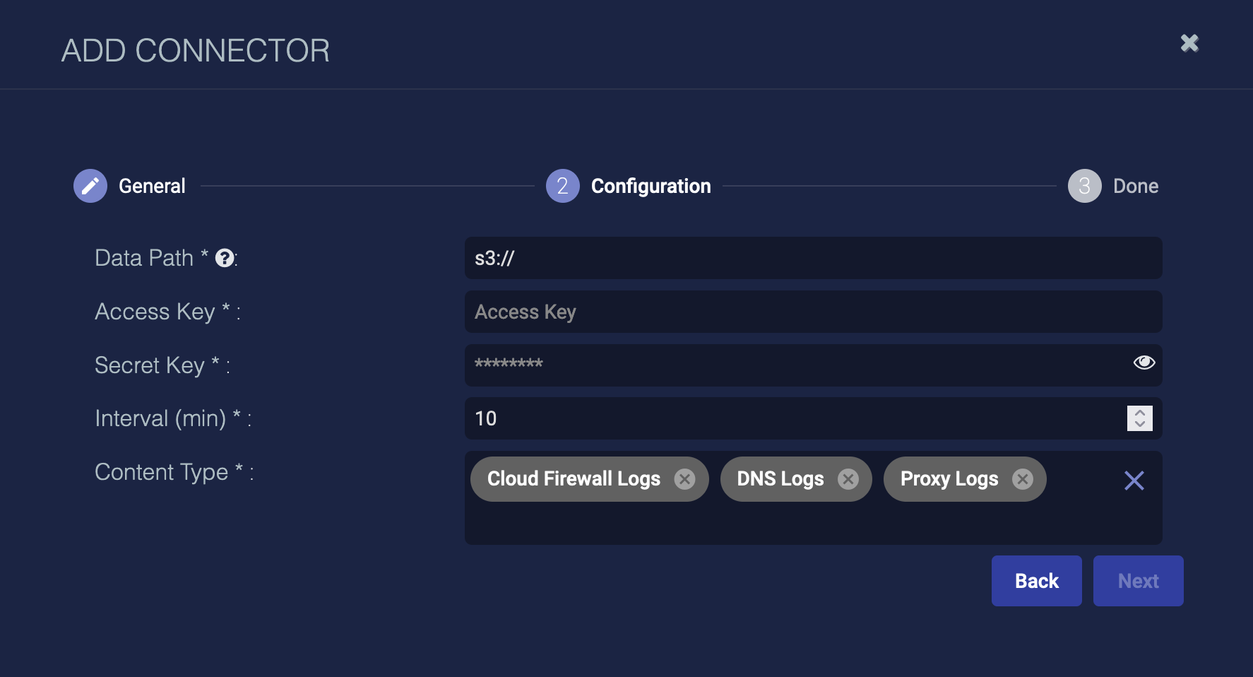 With the data path and keys ready, you can add a Cisco Umbrella connector in Stellar Cyber:
