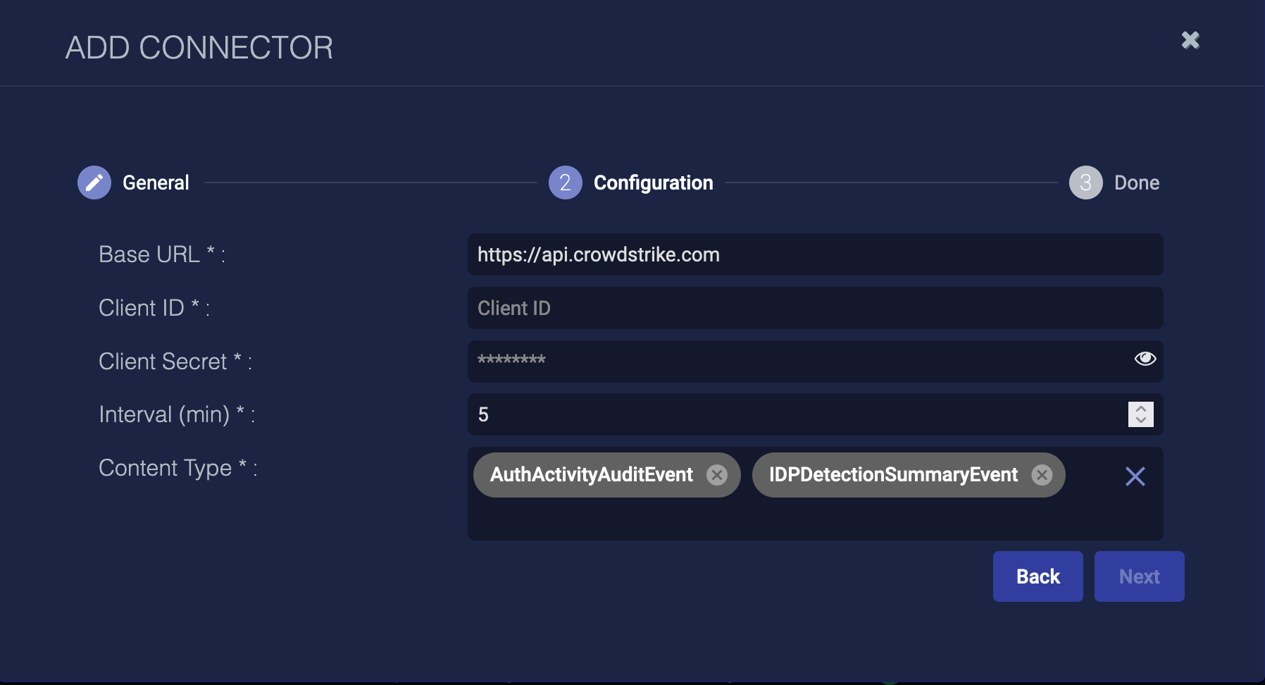 With the configuration information handy, you can add the CrowdStrike connector in Stellar Cyber: