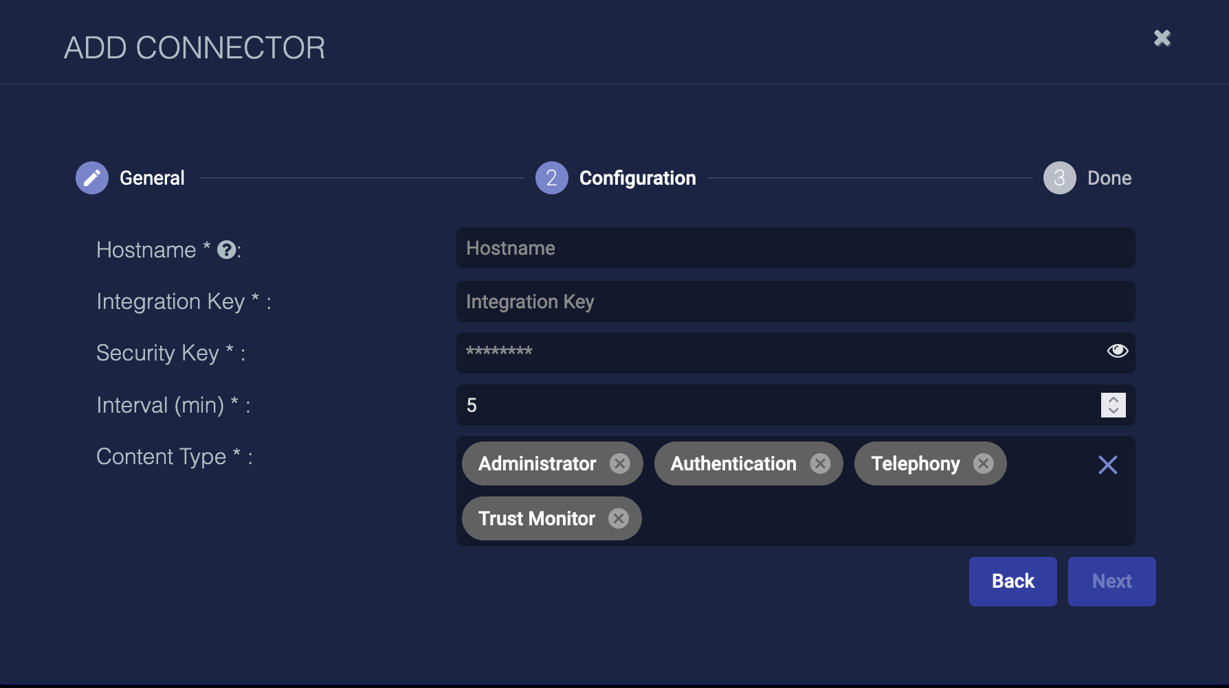 Choose the Content Type you would like to collect. The logs for Administrator, Authentication, Telephony, and Trust Monitor