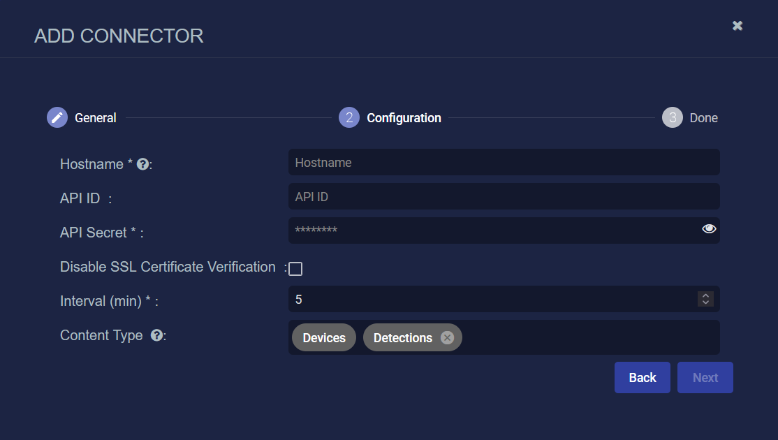 Choose the Content Type you would like to collect. The logs for Detections and Devices are supported.