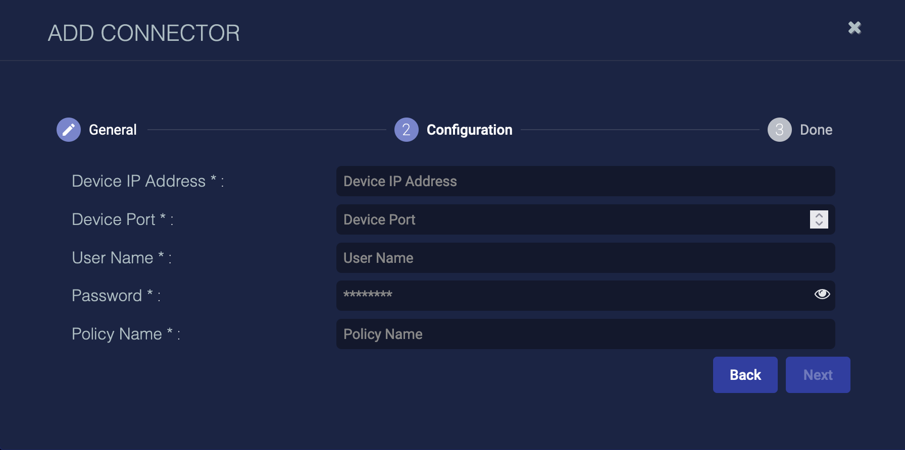 Device IP Address, Device Port, User Name, Password, and Policy Name