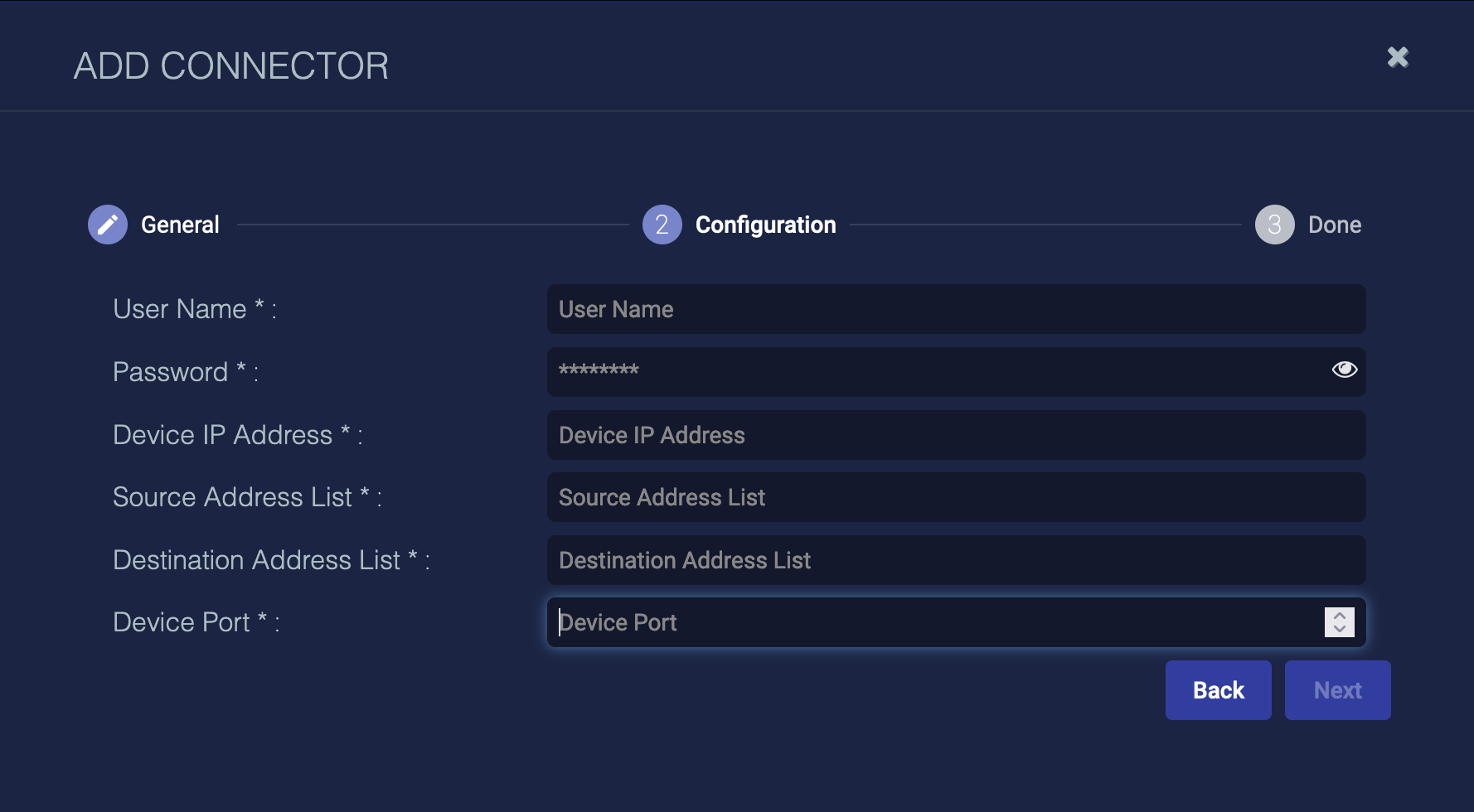 User Name, Password, Device IP Address, Source Address List, Destination Address List, and Device Port