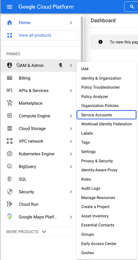 Choose IAM & Admin > Service Accounts. The service accounts appear.