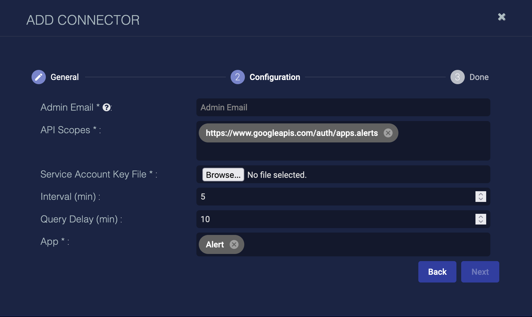 With the Google service account set up and the API key ready, you can add a Google Workspace connector in Stellar Cyber: