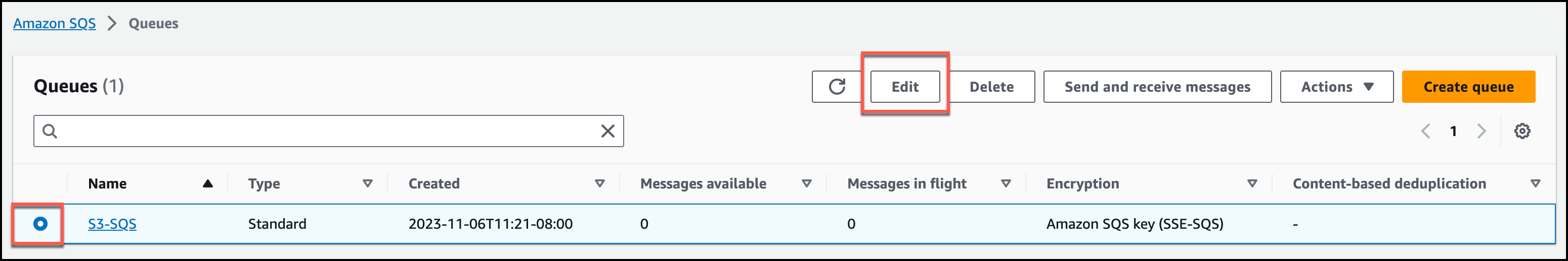 In the Amazon SQS console, in the Queues list, select the queue name.