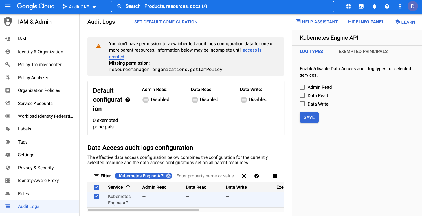 Audit Logs for the service account must have Admin Read, Data Read, and Data Write enabled for the Kubernetes Engine API or for Google Cloud Storage.