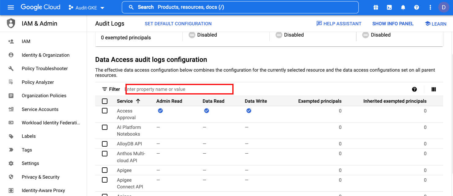 In the page that displays, locate the filter field for Data Access audit logs configuration.
