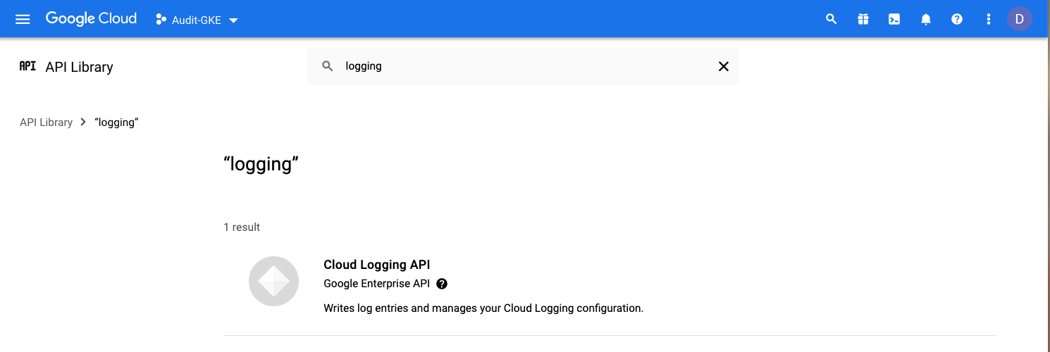Search for logging . The Cloud Logging API option should be at the top of the results.