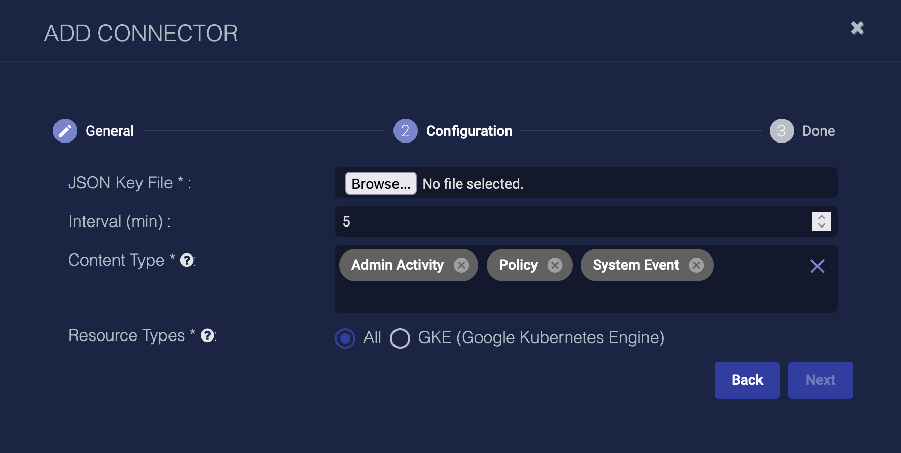 With the Google service account set up and the API key ready, you can add the Google Audit Log connector in Stellar Cyber: