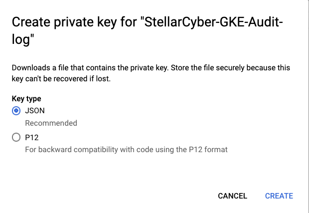 Click Create. The JSON file is downloaded. Keep this file safe, as you cannot recover the key if this file is lost. You will upload this file to Stellar Cyber when configuring the connector.