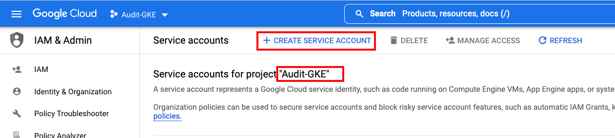 Using the project menu at the top left of the banner, select the project you want to configure to ensure you set up a service account in the correct project area.