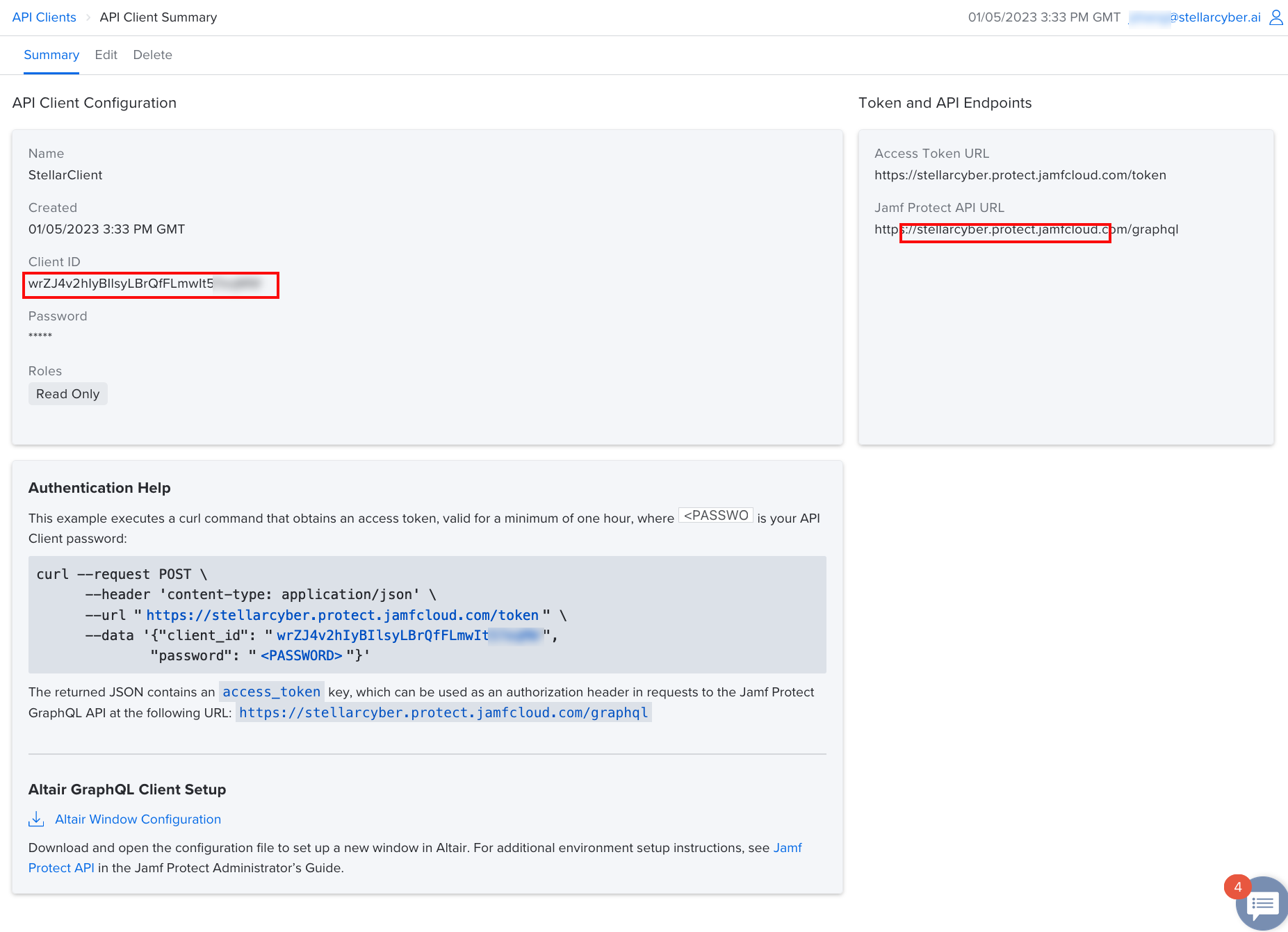 Client ID and password for API client having at least the Read Only role