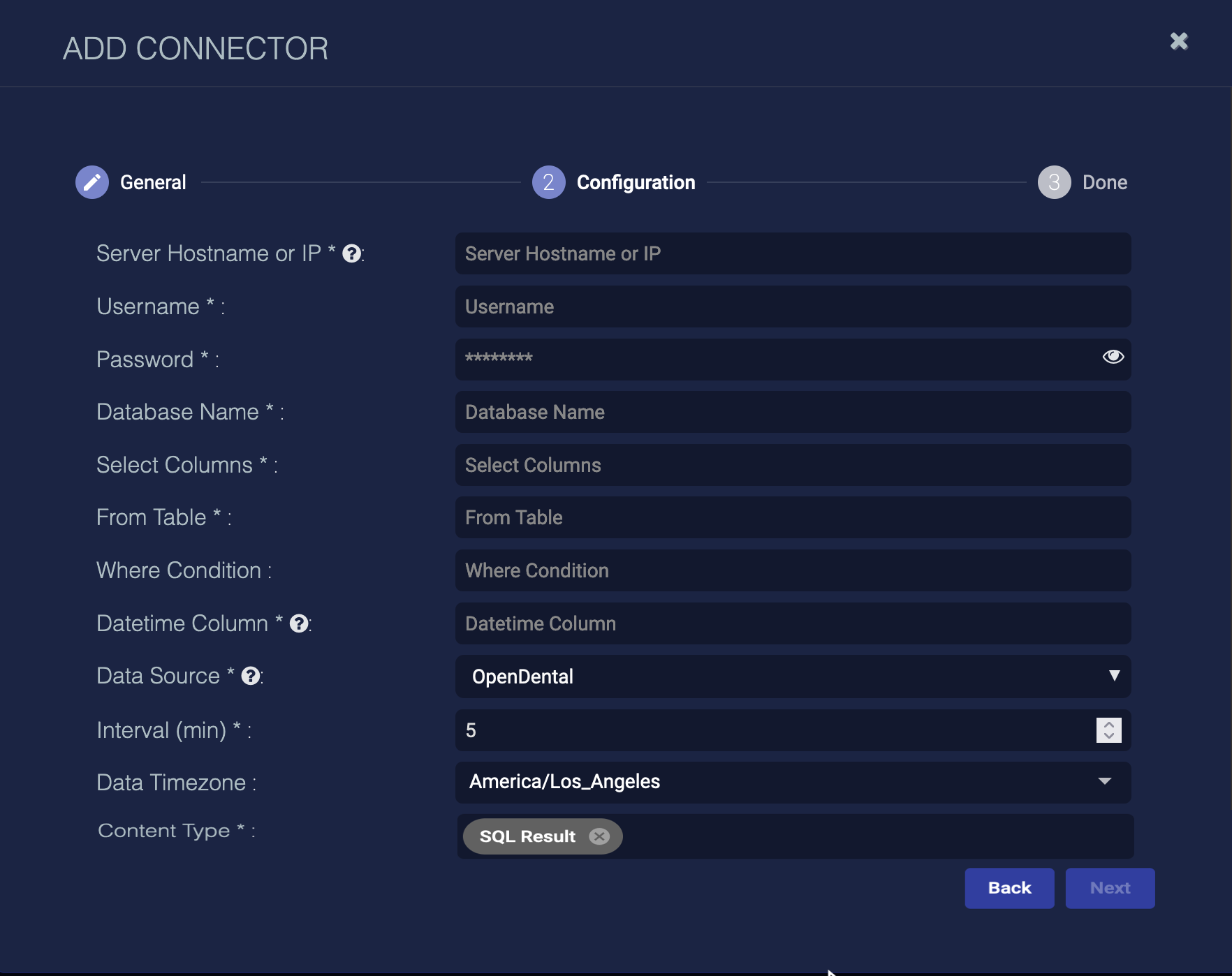 Choose the Content Type you would like to collect. The logs for SQL Result are supported.
