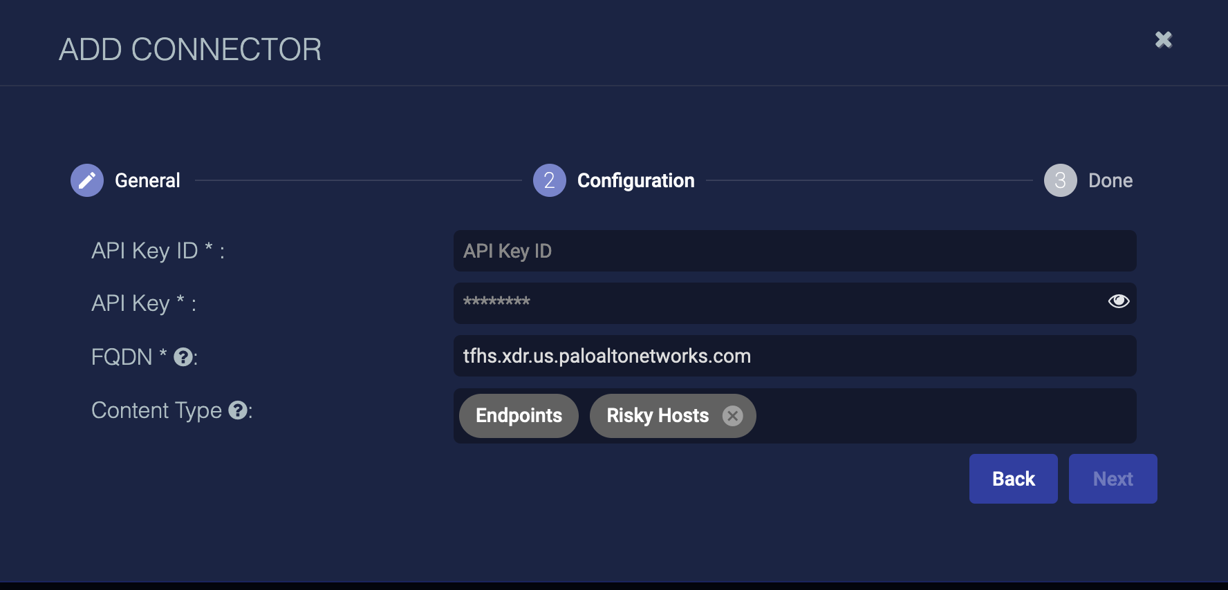 To add a Palo Alto Networks CORTEX XDR connector in Stellar Cyber: