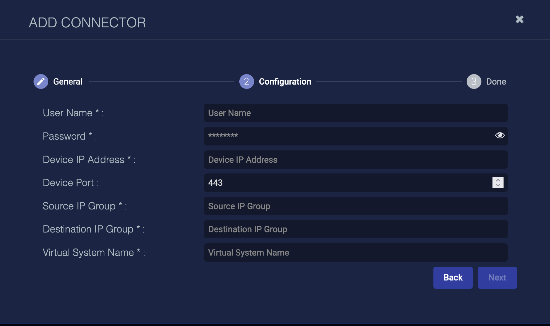 User Name, Password, Device IP Address, Device Port, Source IP Group, Destination IP Group, and Virtual System Name
