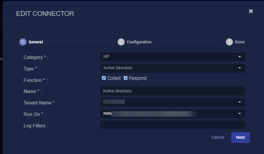 Configure the Active Directory connector as described in Configuring Active Directory Connectors. For Function, select both Collect and Respond.