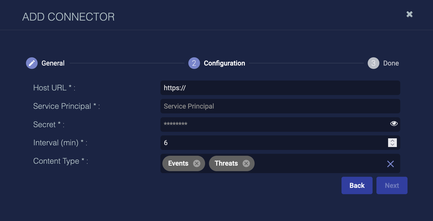 Choose the Content Type you would like to collect. The logs for Events and Threats are supported.