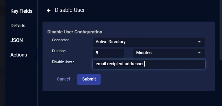 email.recipient.addressescan be a list. When there are multiple recipients in the list, the AD response action, Disable User, will be applied to all recipient addresses in the list.