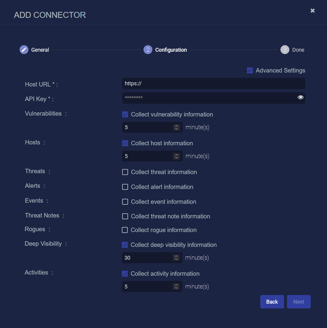 Click the Advanced Settings checkbox to enter the interval, in minutes, for each content type selected. The interval is how often the logs are collected. There are default values for the interval, based on the content type. Most content types have a 5 minute default interval, but Deep Visibility has a 30 minute default interval.