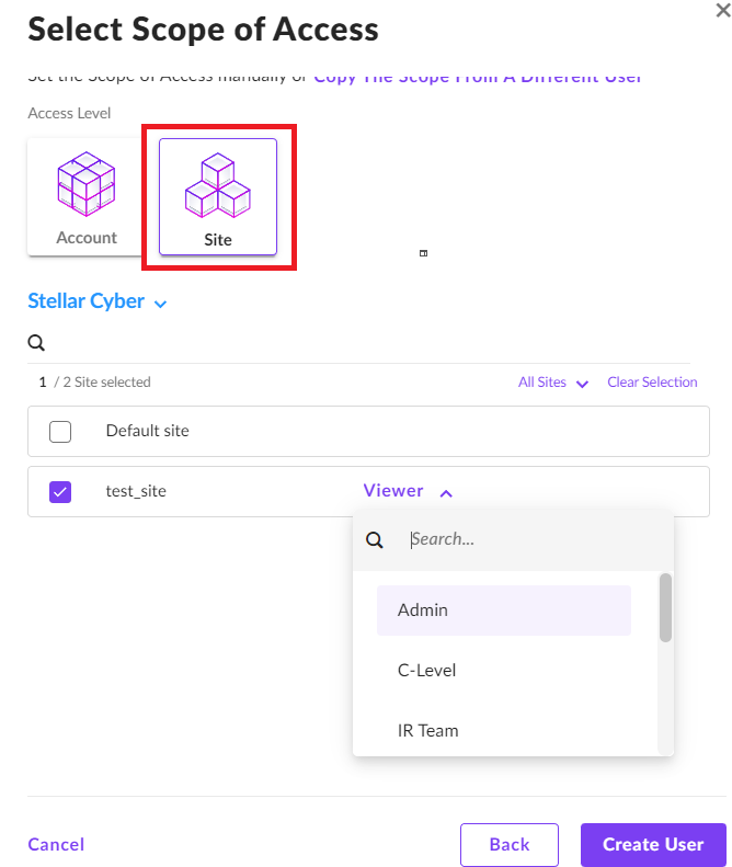 To set the Scope of Access for the Site, select Site. Choose Admin or Viewer from the drop-down menu for the role. Choose Admin for respond actions.