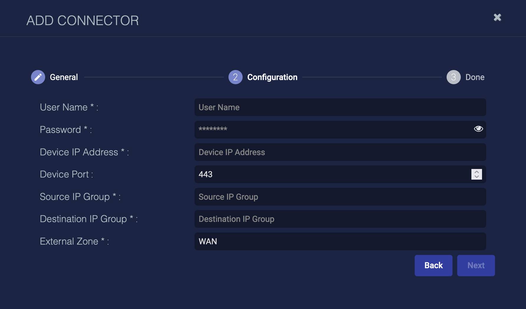 User Name, Password, Device IP Address, Device Port, Source IP Group, Destination IP Group, and External Zone