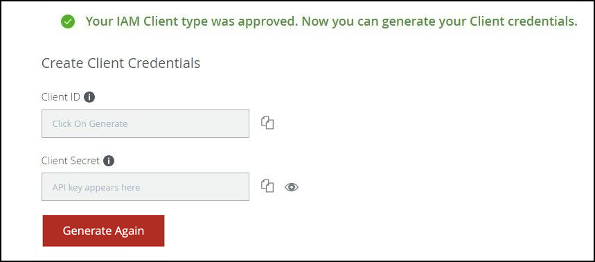Click Request. When the request is approved, the Create Client Credentials section appears on the page.