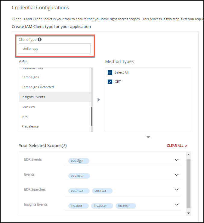 In the Credential Configurations section, enter your Client Type, select the required APIs and Method Types.