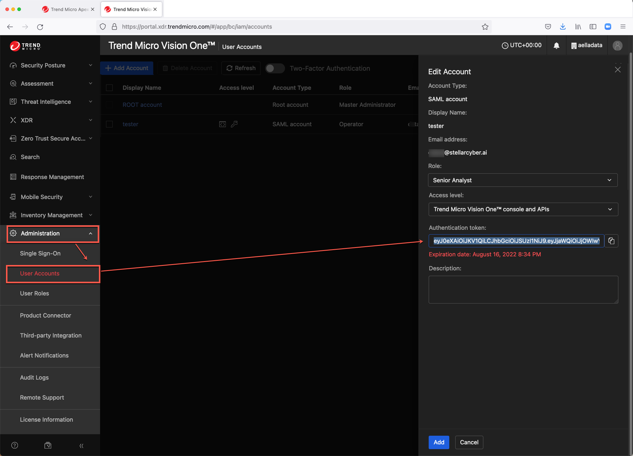 Open the user account that will be associated with your Stellar Cyber connector. Make note of the Authentication token.