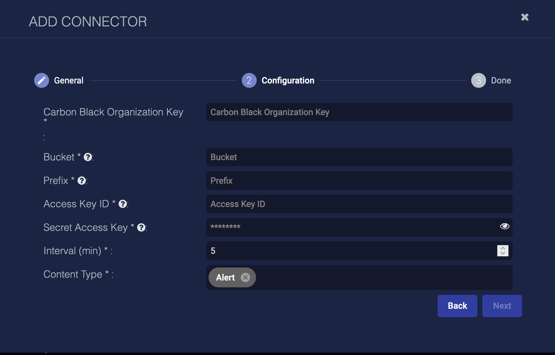 • Carbon Black Organization Key, Bucket, Prefix, Access Key ID, and Secret Access Key