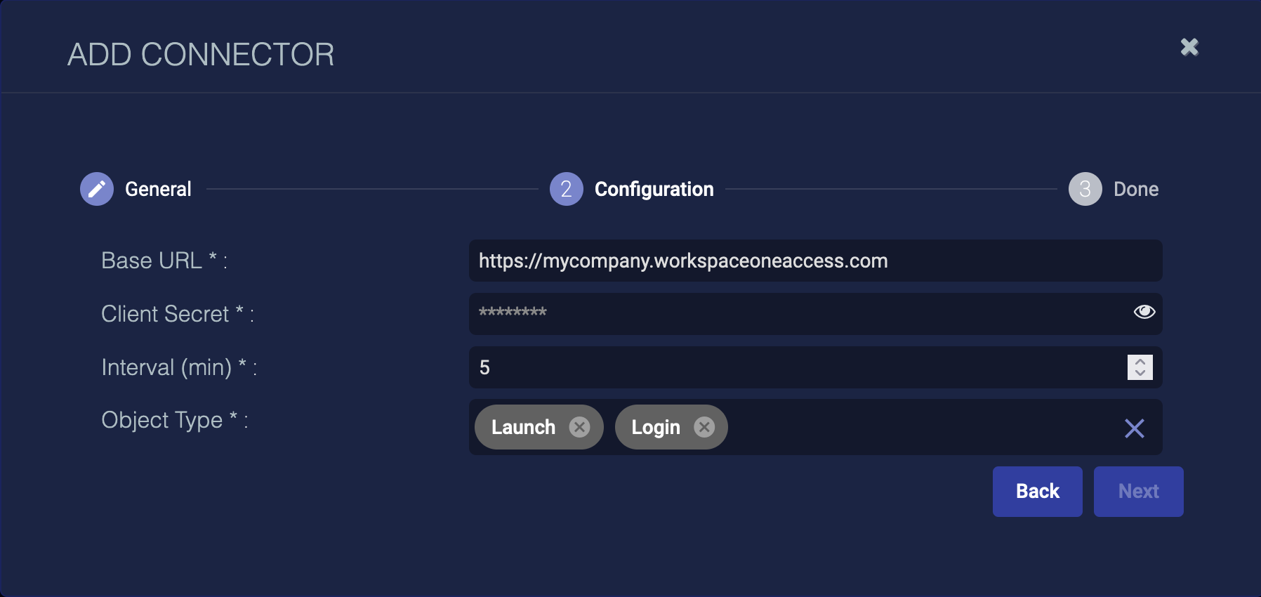 With the access information handy, you can add a VMware Workspace ONE connector in Stellar Cyber: