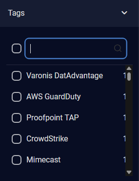 For Tags, select the tags using the check boxes. The number of alerts of each tag is displayed on the right. A scroll bar is available on the right when there are more tags in the list than can be displayed.