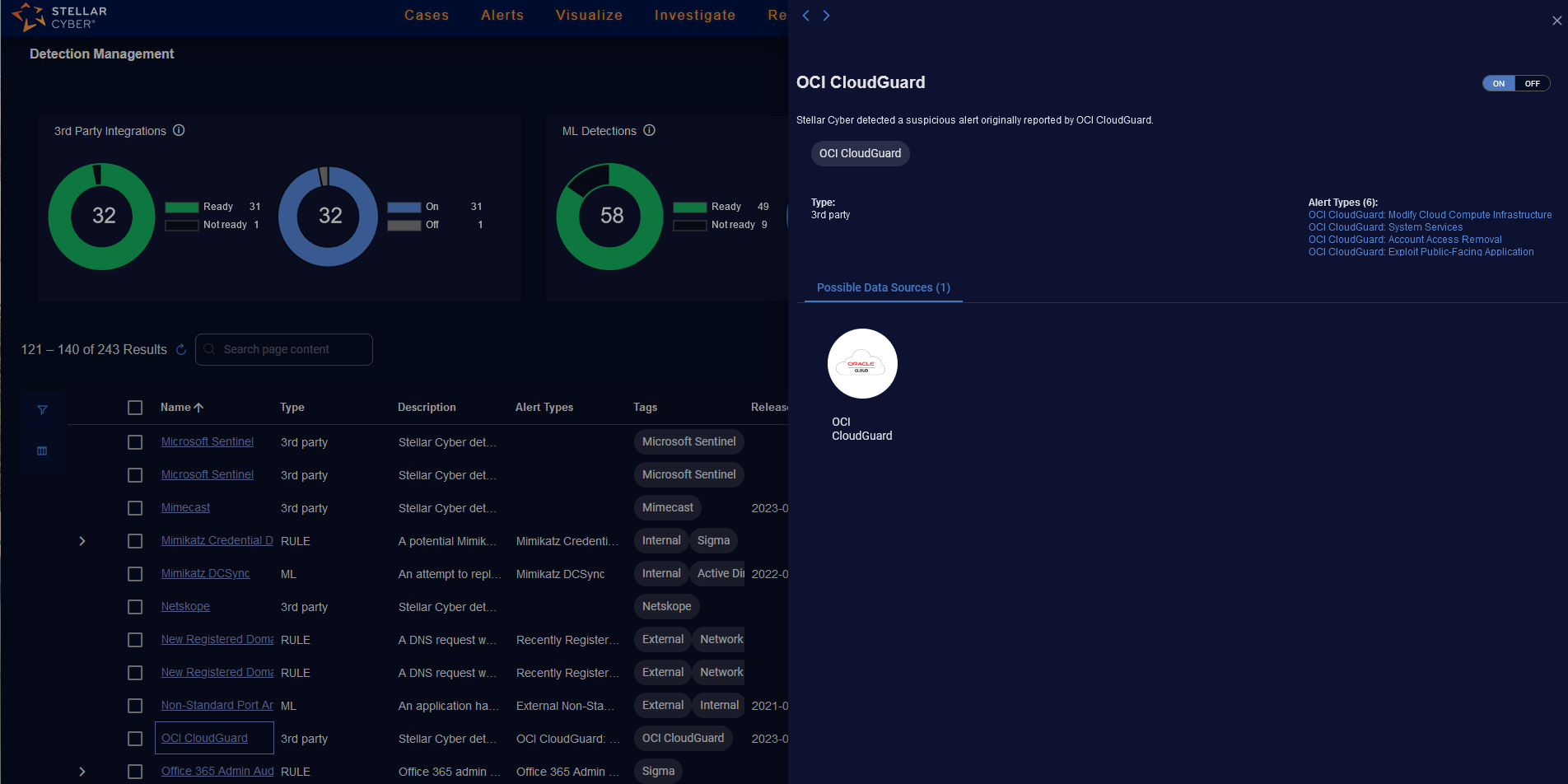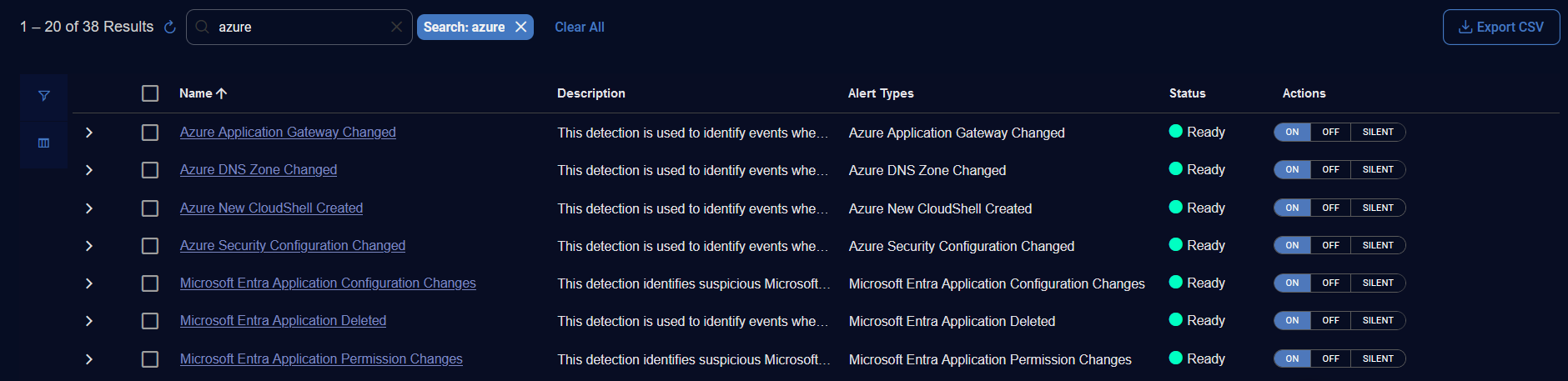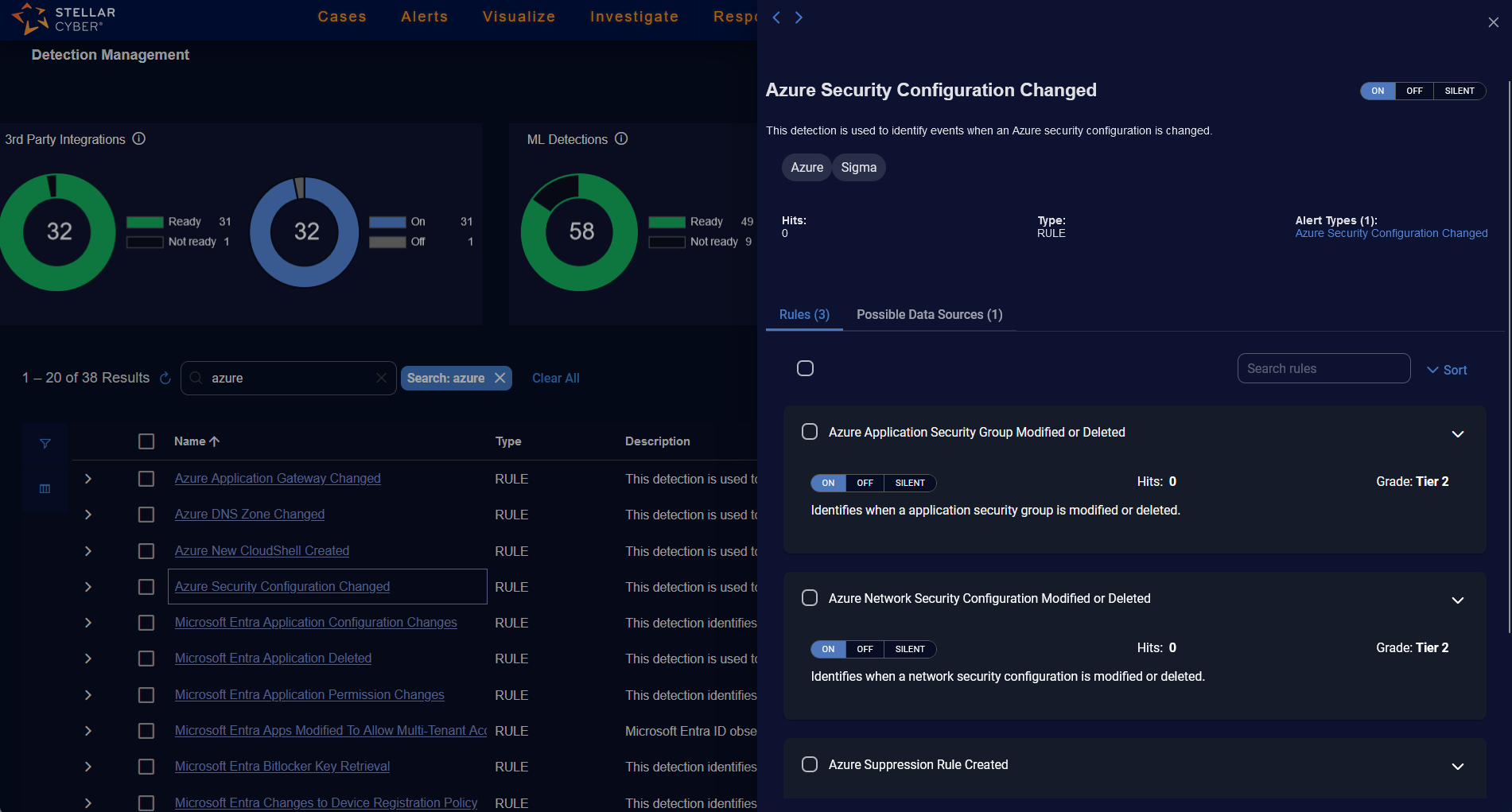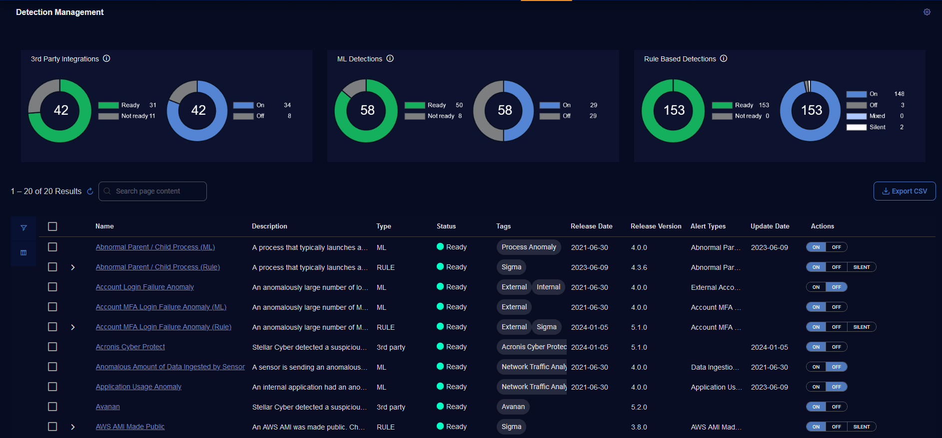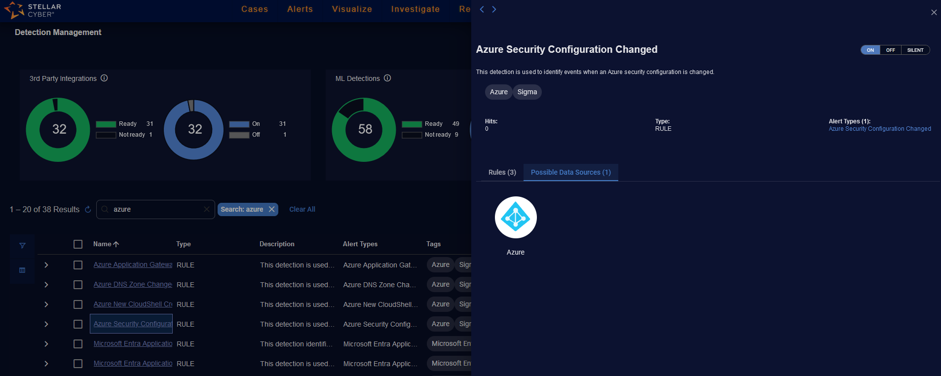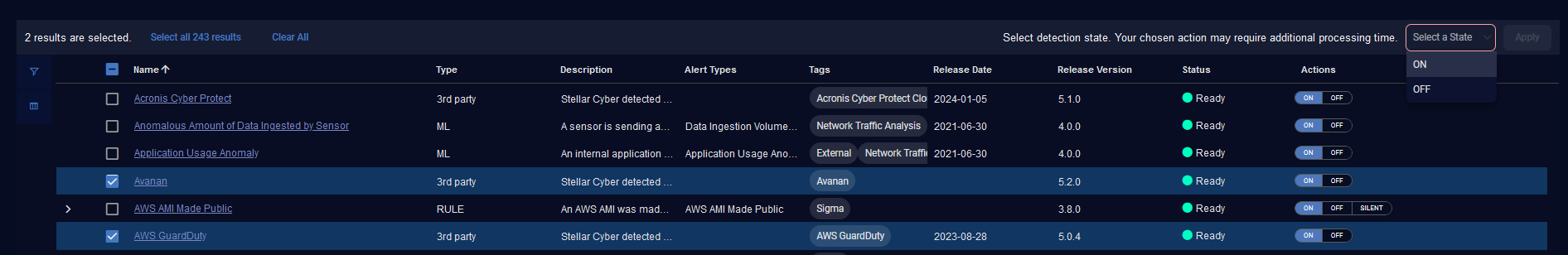Actions—Actions for 3rd Party Integrations and ML Detections to toggle an alert type ON or OFF and actions for Rule Based Detections to toggle an alert type ON, OFF, or SILENT.