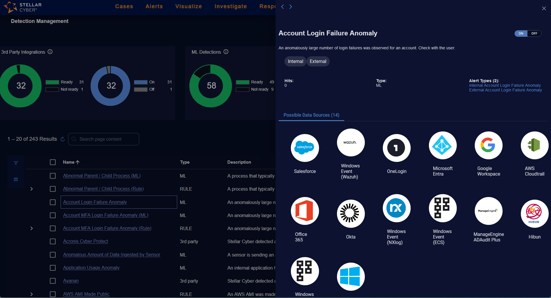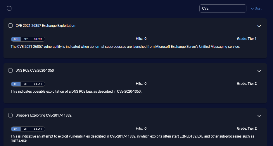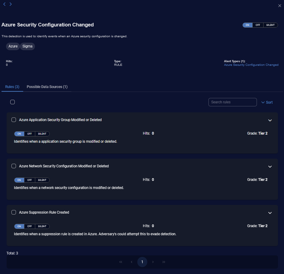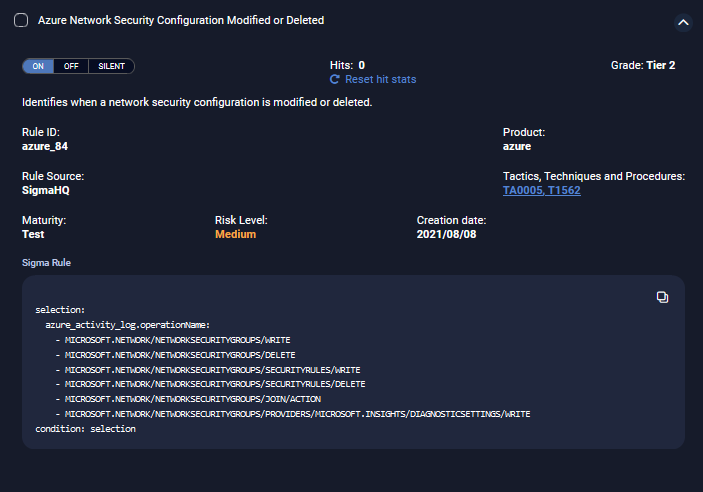 Benefit—Offers granular control over the activation state of detections (On or Off) and Sigma rule detections (On, Off, or Silent), and comprehensive visibility into the performance of each detection through hit statistics.