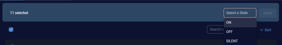 check box to select all rules. If you select all rules, you can change the state on all rules at the same time to ON, OFF, or SILENT.