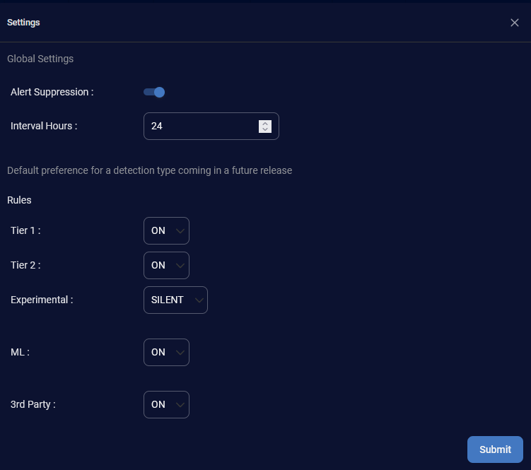 The Settings page has two parts. Use this page to configure alert suppression and interval hours, and to manage how new detections are integrated into your system.